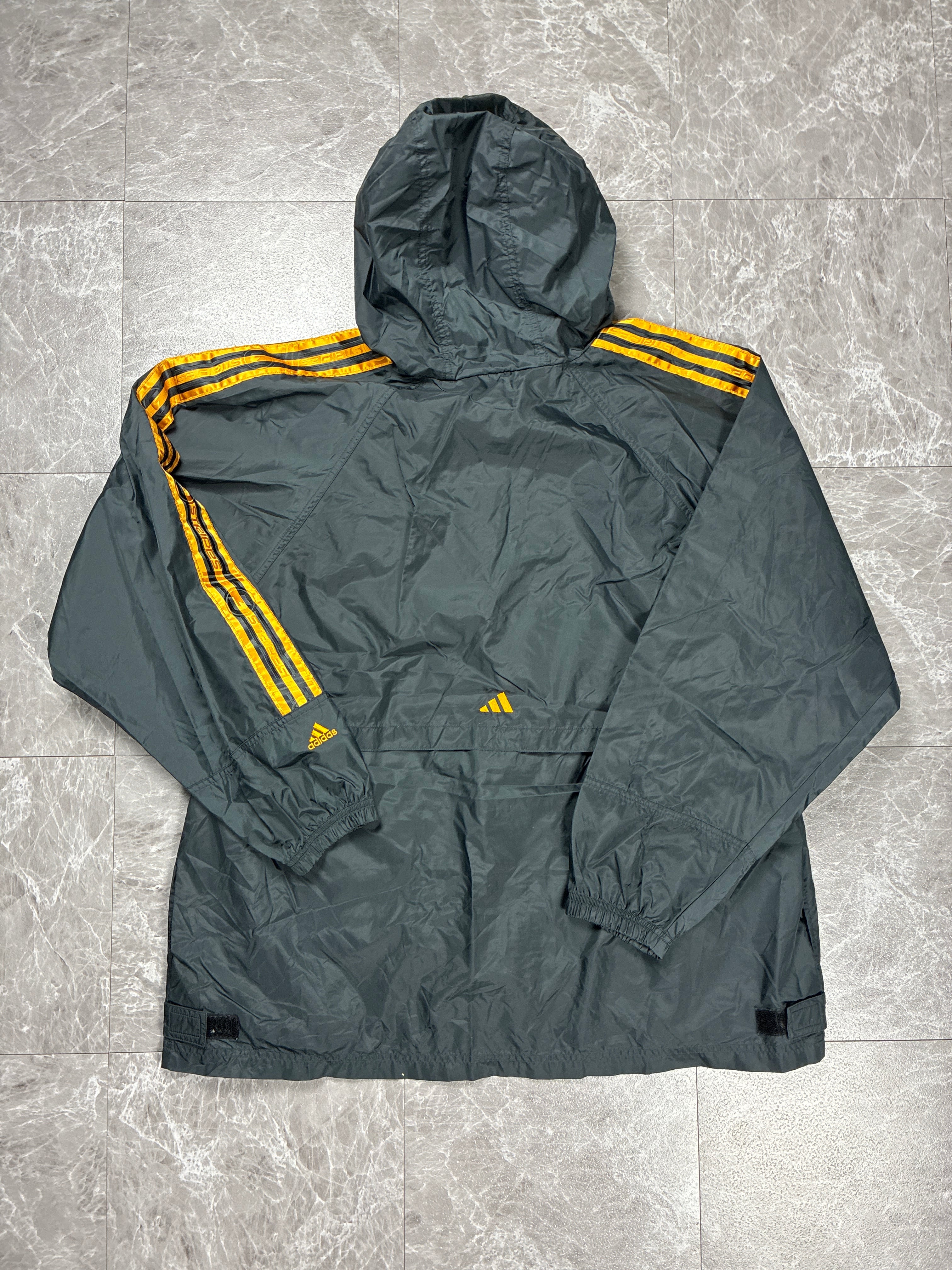 90s adidas ナイロンジャケット ダークグレー L-XL相当 フード パーカー 3ライン オレンジ アディダス ウインドブレーカー スポーツ 古着